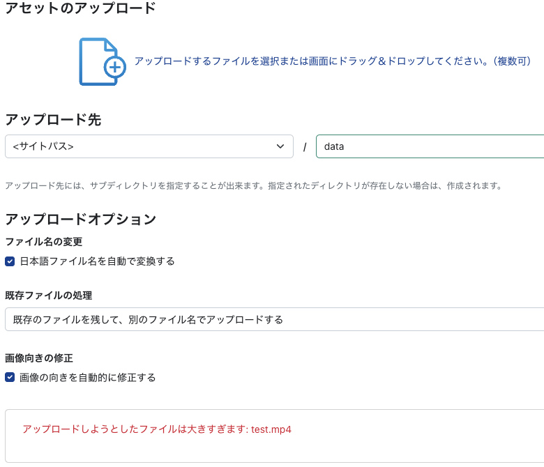 デフォルトではアップロードの上限は20MBとなっているようで、上限を超えたファイルをアップロードしようとすると以下のようにエラーが表示されます。