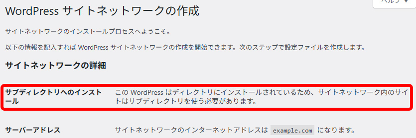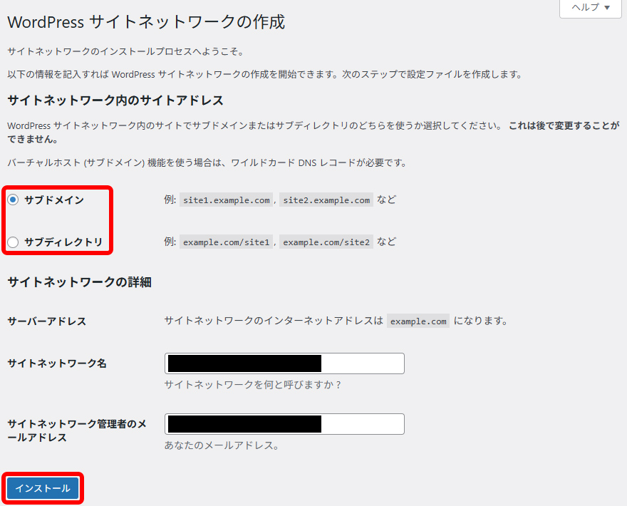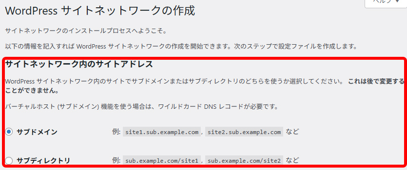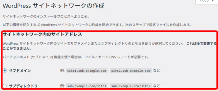 サイトネットワークの作成画面で設定したサイトアドレスですが、WordPressのインストール方法によってはサブドメインが選択できない場合があるようです。