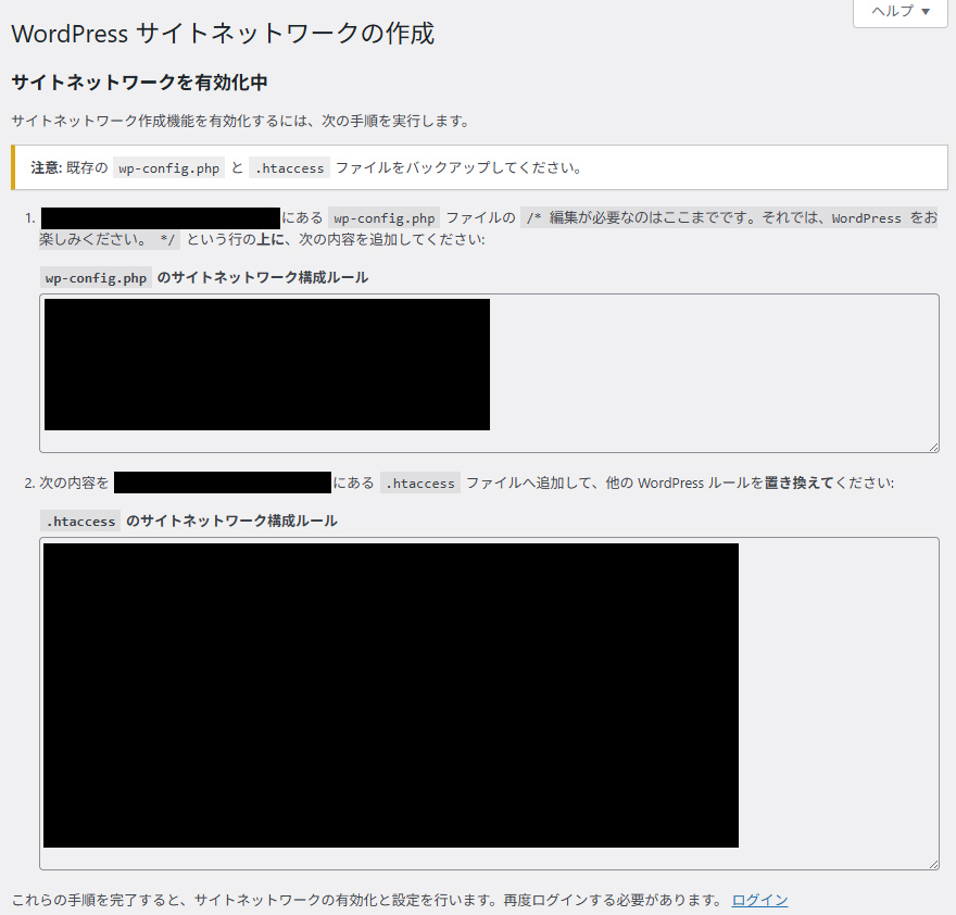 画面の指示に従って、wp-config.phpと.htaccessに追記、書き換えを行います。
