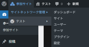 参加サイトにホバーすると、サイトネットワークのメニューやマルチサイトで管理しているサイト一覧などが表示されます。