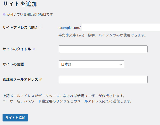 サイトアドレスとサイトのタイトル、管理者メールアドレスを入力して、サイトを追加をクリックします。
