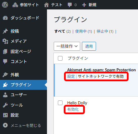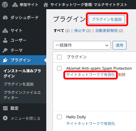 サイトネットワークで有効化を行うと、各サイトでそのプラグインが有効化されます。