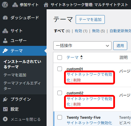 テーマについてもプラグインと同じで、各サイトからの追加はできず、サイトネットワークで追加する必要があります。