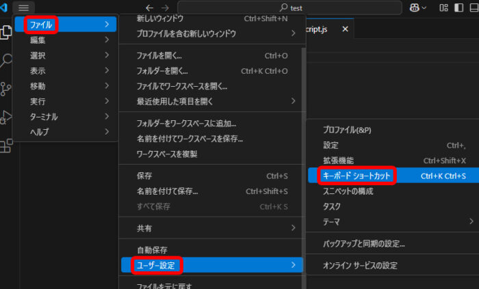 ファイル > ユーザー設定 > キーボード ショートカット を選択します。