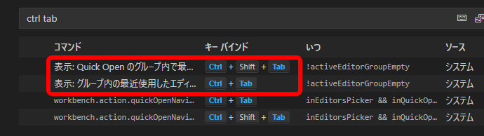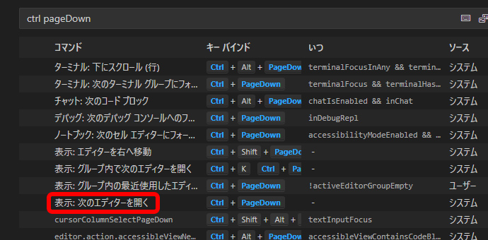 こちらは「表示: 次のエディターを開く」や「表示: 前のエディターを開く」でも検索できます。