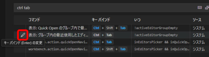 今回はCtrl + Tabキーで左右のタブに切り替えられるようにしたいので、既存のショートカットキーの動作と左右に切り替えるショートカットキーを入れ替える形で対応します。