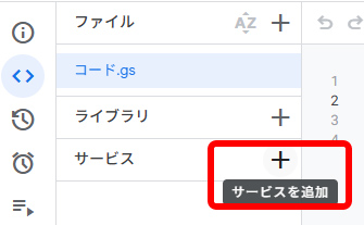 今回使用するYouTube Data APIはGoogle Apps Scriptのサービスに用意されているので、左メニューのサービスを追加を選択します。
