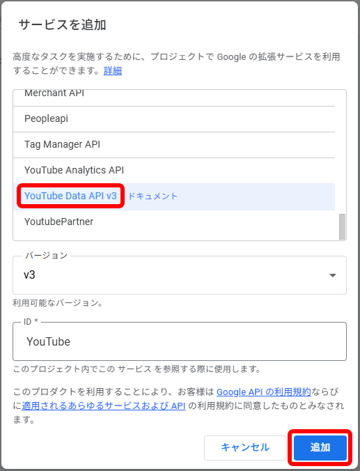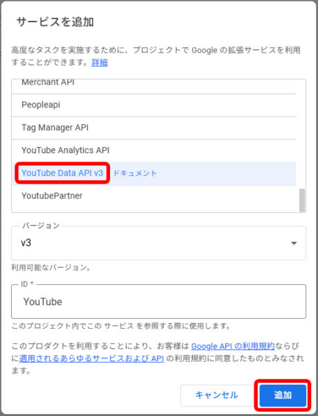 サービスの一覧からYouTube Data APIを選択して、追加します。