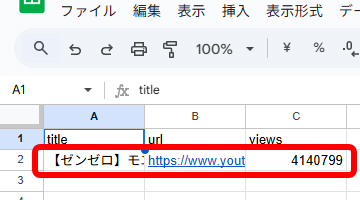 初回実行時は許可のリクエストが表示されるので許可すると、スプレッドシートに指定した動画の情報が出力されました。